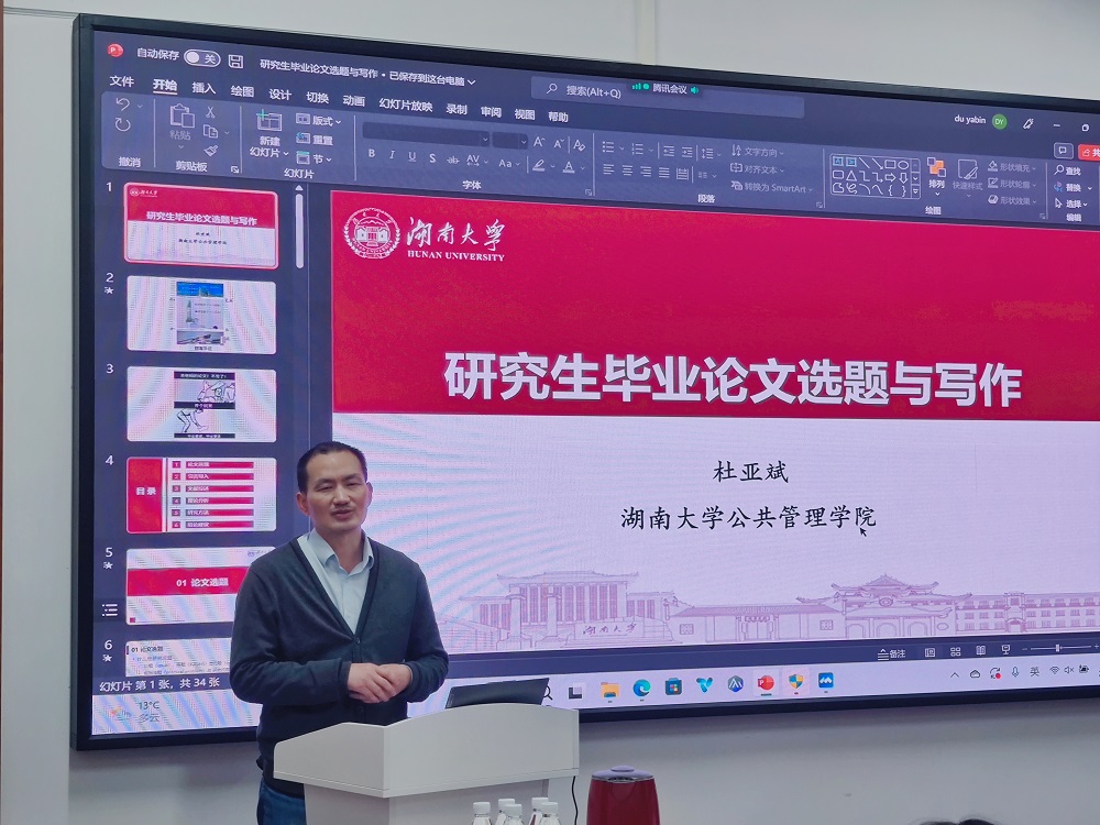 助理教授杜亚斌老师受邀担任本场活动的主讲人,做了题为“研究生毕业论文选题与写作”的主题讲座。本次论坛是庆祝湖南大学公共管理学科恢复二十周年系列活动之一。永利娱乐-澳门永利集团