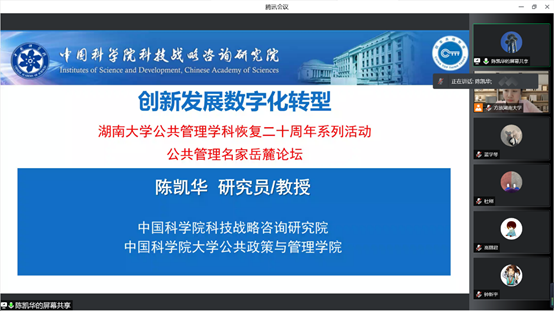 举办2022年第4期公共管理名家岳麓论坛——“创新发展数字化转型”。本次论坛以线上学术讲座的形式开展,也是庆祝湖南大学公共管理学科恢复二十周年系列活动之一。中国科学院科技战略咨询研究院研究员、中国科学院大学公共政策与管理学院教授、中国科学学与科技政策研究会副秘书长、常务理事、青工委主任陈凯华受邀担任本次论坛的主讲人,永利娱乐