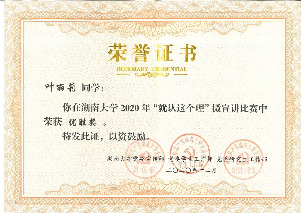 非常荣幸能够在“就认这个理”微宣讲比赛中获奖。同时,我也非常感谢党支部给予我的这次参赛机会以及党支部书记王浩的帮助。人们常说,一粒种子,只有深深地植根于沃土,才能生机无限。作为班级的一员,只有在同学们的互帮互助中才能行稳致远。所以,接下来的研究生学习希望能够和大家一起为了理想努力奋斗,希望湖大见证我们的成长。