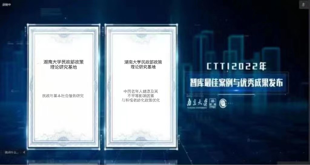 开展建设,是民政部首批部级政策理论研究基地之一。经过几轮选拔,2019年12月5日,基地成功入选中国智库索引CTTI来源智库。基地依托民政部和湖南大学两大平台,自成立伊始,便致力于民政政策理论研究,为各级民政部门提供决策咨询,推动社会治理体系及治理能力现代化,助力于保障和改善民生。成立三年多以来,面对新形势新要求,民政部政策理论研究基地锐意进取、不断创新,围绕党和国家民政事业发展的目标任务和大政方针作出了科学谋划,扎实推进智库建设,形成了持续的影响力。基地聚焦民政热点、依托学科优势,对全国民政政策领域的核心理论问题和热点实践问题开展专题研究,为政府部门科学决策提供智力支持,在科学研究、政策咨询、社会调研、社会影响力、荣誉获奖等方面均取得了跨越式发展,赢得政府部门与社会各界的好评。