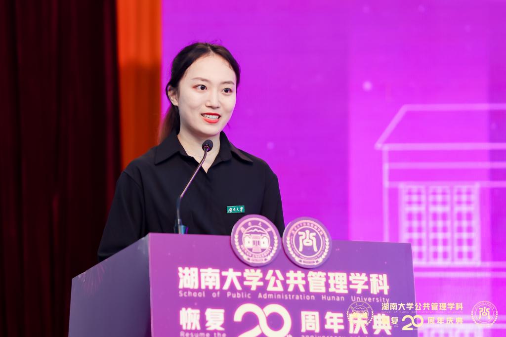 2021级研究生王钰霞作为在校生代表发言。她表达了对湖南大学公共管理学科恢复二十周年的诚挚祝福,并感谢学院对学生发展的支持、学院老师对学生成长成才的精心培育。她表示,未来公管学子们将秉承对公共管理学科的感激和敬畏,肩负前辈们的殷切期望,努力成为具备独立思考能力、公共事务洞察力、能够担当公共责任的新时代人才。