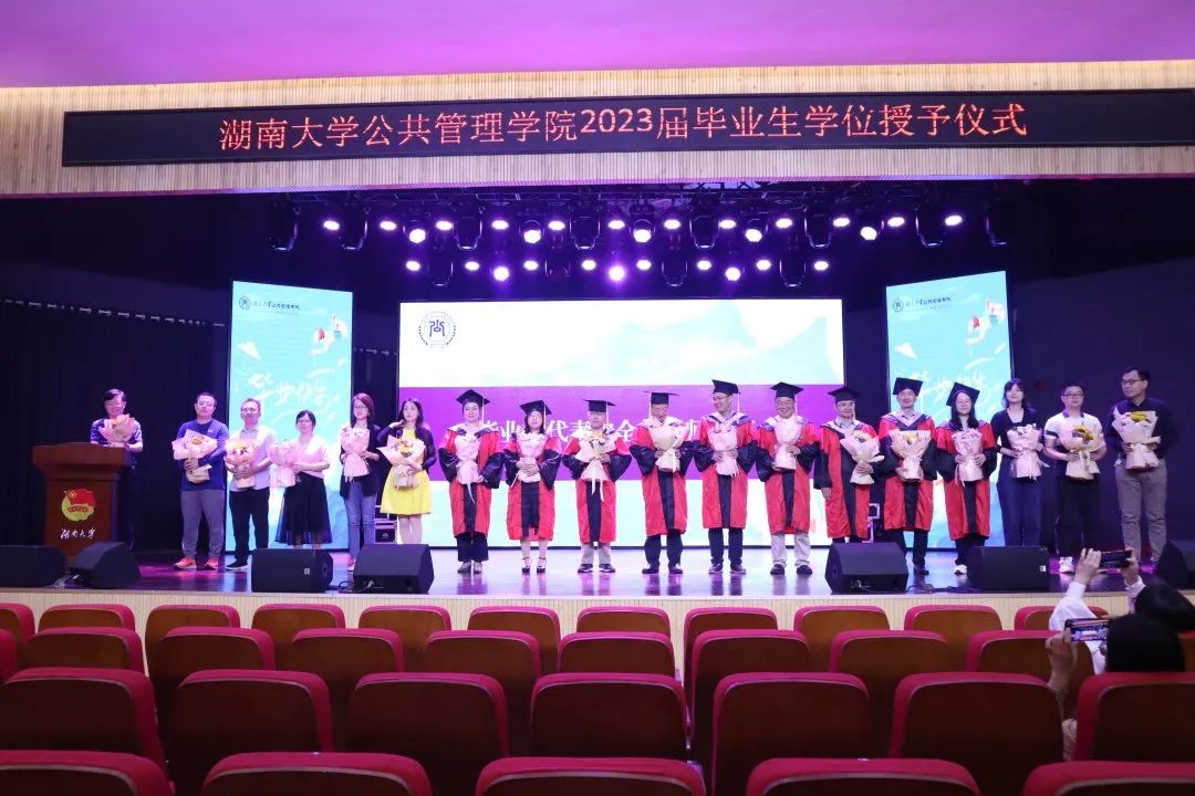 在天马小剧场举行2023年毕业典礼暨学位授予仪式。党委书记付蓉芬、院长李连友、副院长雷玉琼、副院长徐莹、副院长谭海波、MPA中心主任颜克高,学院教师代表,全体辅导员,全体本科毕业生、科学学位毕业研究生,各班学生代表参加仪式,院党委副书记杜倩博主持。