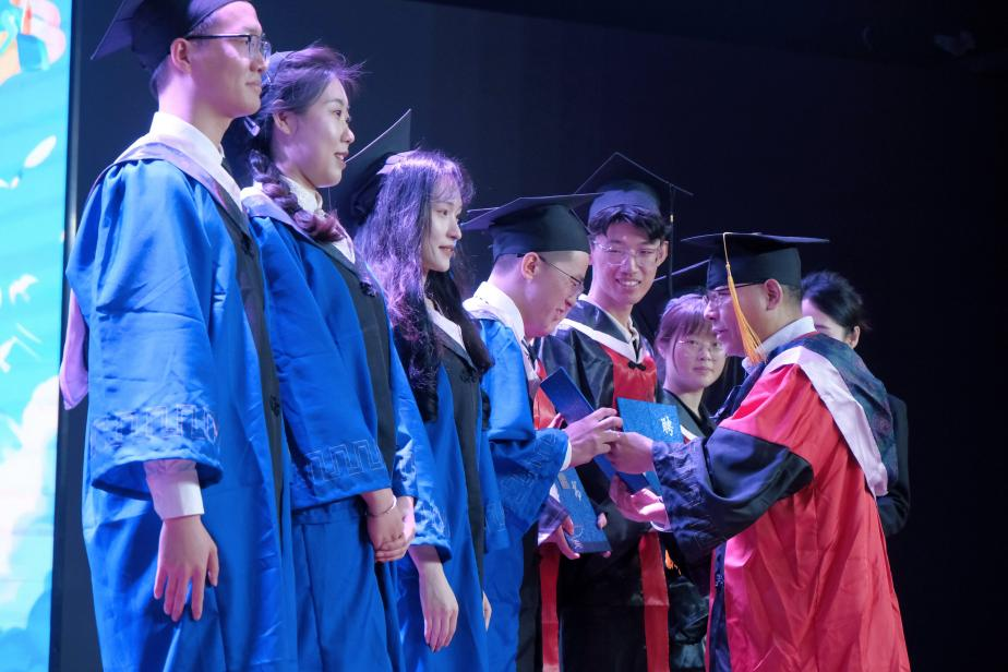 在学位授予仪式环节,谭海波副院长宣读授予本科生、科学学位研究生学位的决定,学院学位评定委员会委员分三组为毕业生拨穗并颁发学位证书,并与每一位毕业生合影留念。