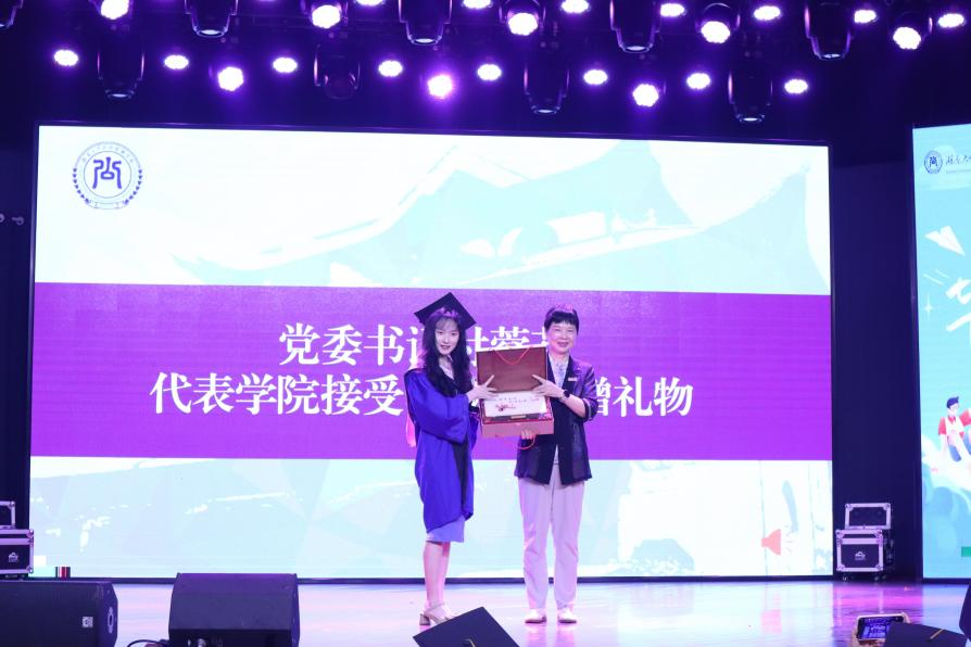 在学院领导与毕业生互赠礼物环节,党委书记付蓉芬代表学院分别接受本研毕业生代表馈赠学院的礼物,向他们表示感谢并合影留念。毕业生代表向学院教师献上鲜花,表达他们对老师的感激与惜别之情。