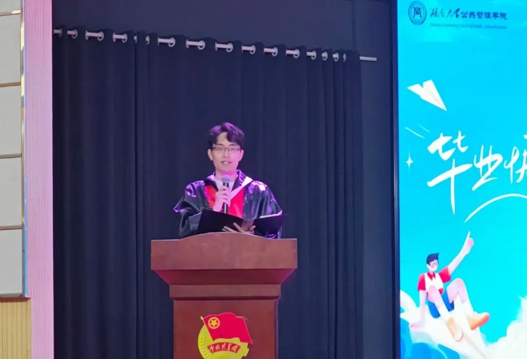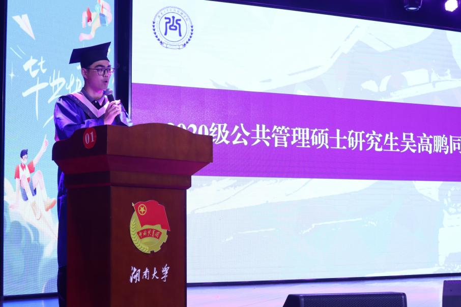 吴高鹏代表2023届硕士研究生发言。他首先深情回顾了难忘的在校时光,表达了对母校、学院与老师们的由衷感谢。他表示,学院教诲学生们拥有不畏艰险、砥砺奋斗的宝贵品质,激励着公管学子敢于面对变化、应对挑战。随后,他号召全体毕业生牢记“实事求是,敢为人先”的校训,践行“求是尚公,经世致用”的院训,立足岗位,服务人民,报效祖国。最后,他祝愿毕业生前程似锦,在为人民服务的实践中坚守湖大公管人的初心使命。