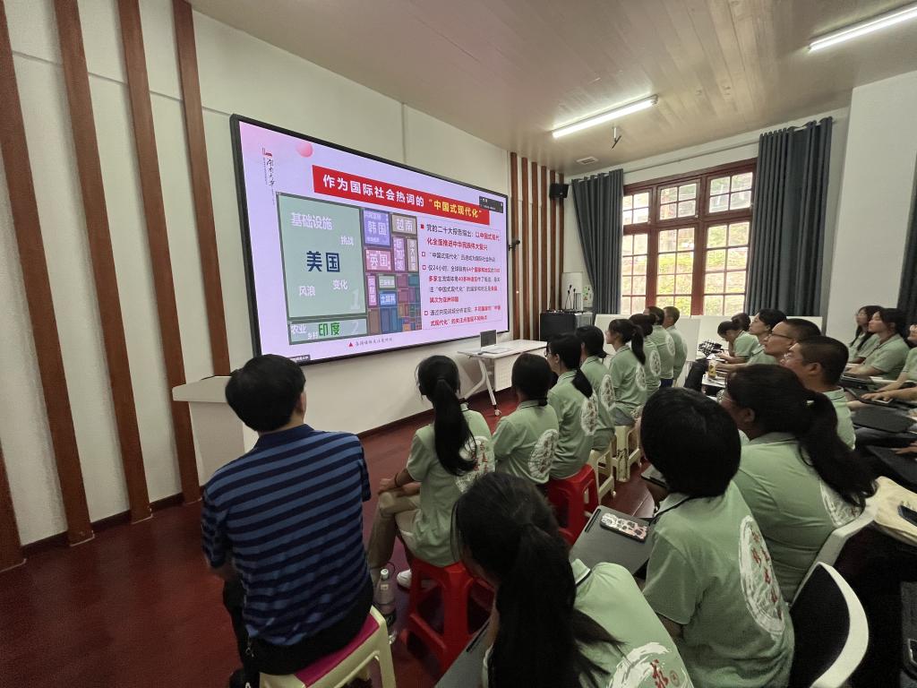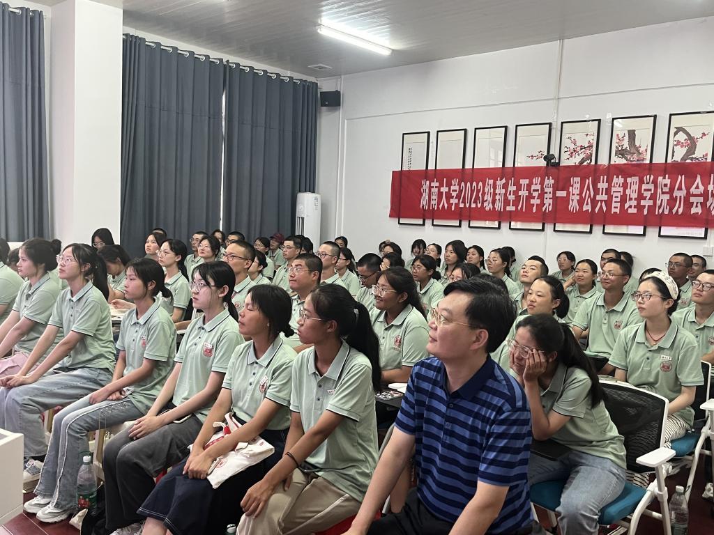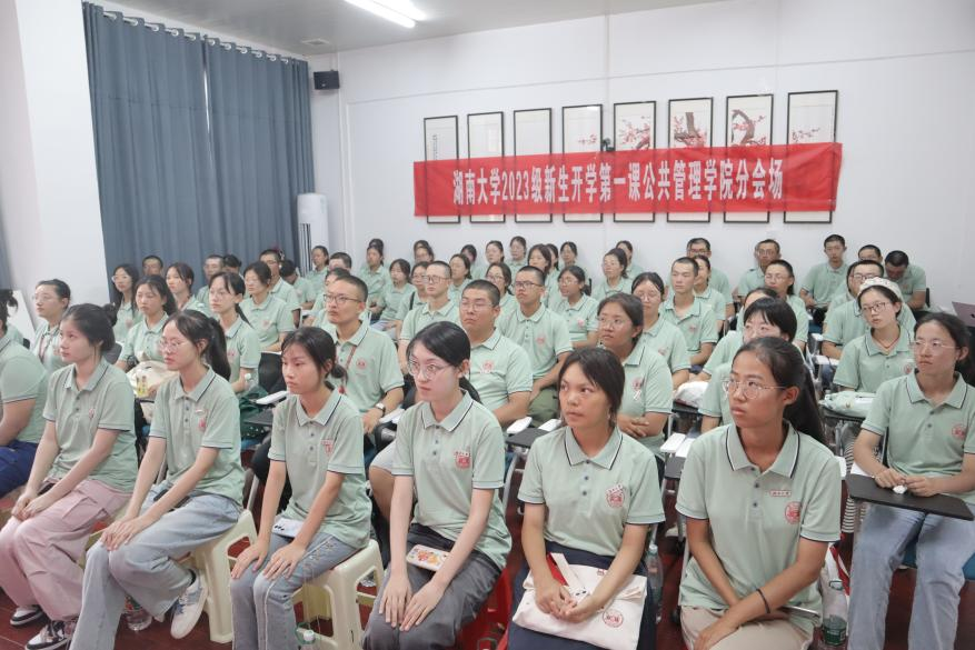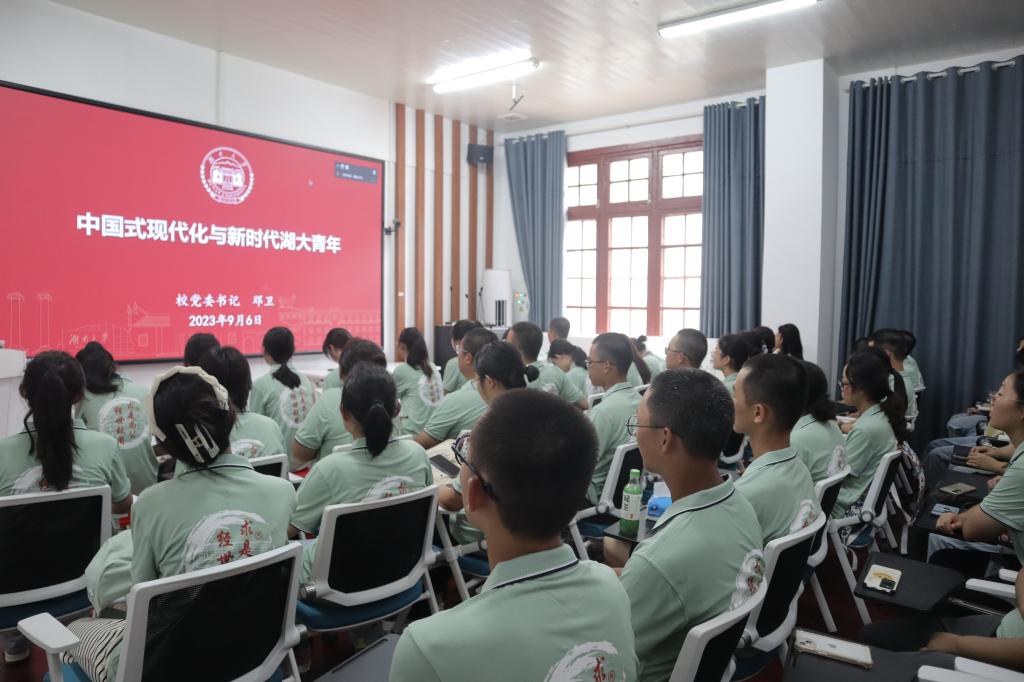9月6日下午,湖南大学党委书记邓卫老师为全体2023级本科新生讲授了一堂主题为“中国式现代化与新时代湖大青年”的开学第一课。永利娱乐 15名23级本科新生代表前往湖南大学大礼堂主会场集中聆听,其余新生于永利娱乐 院楼220与221教室分会场观看直播。永利娱乐 党委副书记杜倩博老师、辅导员胡春晖老师出席并一同收看直播。