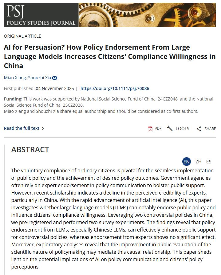 向淼老师合作的论文“AI for Persuasion? How Policy Endorsement From Large Language Models Increases Citizens’ Compliance Willingness in China”(《说服性人工智能?大语言模型的政策背书如何提升公众的政策遵从意愿》)于国际权威期刊Policy Studies Journal在线发表。Policy Studies Journal是美国政治学会(APSA)公共政策分会的旗舰期刊,是湖南大学校定A1类期刊,在政治学、公共政策与公共管理领域享有极高声誉。期刊2024年的影响因子为4.9,在48本公共管理类SSCI期刊中排名第5,在187本政治学SSCI期刊中排名第12。