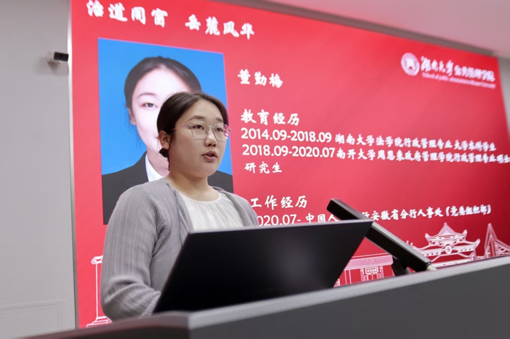 交流会伊始,杜倩博向在场师生介绍八位校友代表,他们当中有人在政府机关和国有企业从事公共管理实践,有人担任高校辅导员立德树人,也有人正在名校继续深造。今天,校友们重聚岳麓山下,以“过来人”的身份与师弟师妹们分享成长经验。