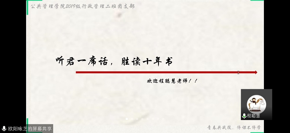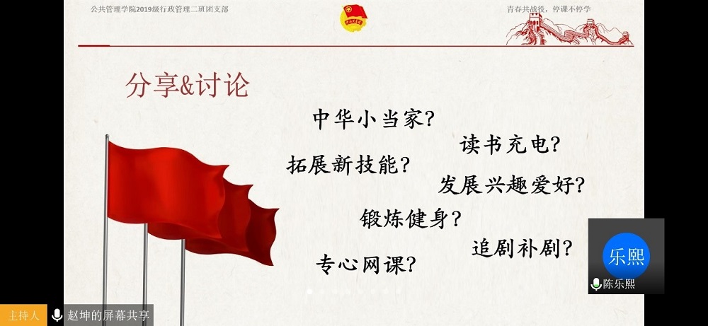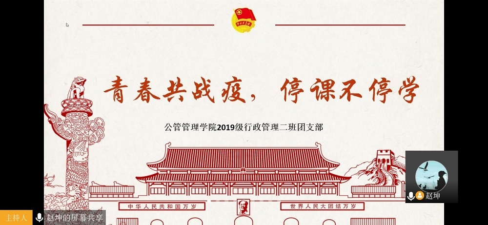 为进一步激发大学生的责任担当,转变学生学习观念,加强沟通交流,营造在家学习的良好氛围,确保在线学习效果,321日,行政管理1902团支部采用特殊线上形式组织开展“青春共战疫,停课不停学”主题团日活动。此次活动由行管1902团支书赵坤主持,班主任程聪慧老师和全体同学参加。