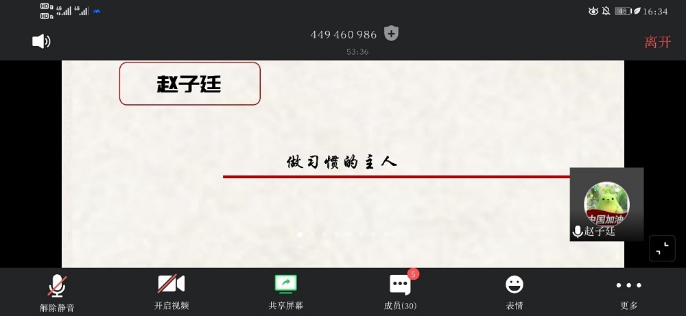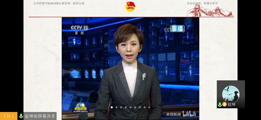此次活动主要包括国家政策解读、网课学习分享、宅家成长分享三个阶段。首先,同学们观看一则《新闻联播》关于疫情纪实的新闻短片,团支书赵坤结合时政报道向全体同学分析当前疫情形势,提醒同学们不可松懈疫情防控,警惕一切突发状况。同学们深入了解习近平总书记对新冠肺炎疫情作出的重要指示和党中央、国务院作出的重大部署,纷纷表示在特殊的困难时期,中国展现了大国担当和大国风度,也使同学们坚定打赢疫情防控人民战争的信心和决心。