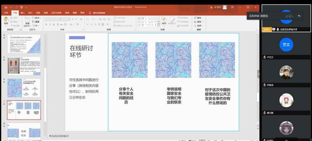 接下来的研讨环节,多位同学踊跃发言,就现实事件、专业知识以及疫情防控三个方面交流了自己的观点。沈美吟讲述了她对网络安全问题的看法,她表示当今时代网络已经融入到每家每户的生活,同样也兴起了新的网络犯罪手段,网络安全必须受到重视。裴文静对沈美吟同学的发言进行补充,她提醒同学们飞机、高铁票等条形码往往涉及个人信息,希望大家重视起来,保护好个人信息安全。舒永欢则将所学知识与讨论主题结合起来,分享了自己对于国家安全与本专业联系的看法,谈到自己对公共安全应急处理和医疗废物处理的调查思考,希望国家未来能够建设更完善的应急管理制度。甘珏和腊炳辉就如何看待国家文化安全发表了自己的看法,呼吁同学们树立正确的价值观,树立文化自觉与文化自信,“尽管政治、经济、社会安全似乎听起来很遥远,但作为新时代的青年人,我们可以从自己和身边做起,爱国爱党,自觉维护维护国家文化安全。”段瑞洋分享国家安全教育课学习感悟; “我们应该提高生物安全意识,不仅仅是确保自身的安全,更可以去倡导和呼吁身边的人注意生物安全。”