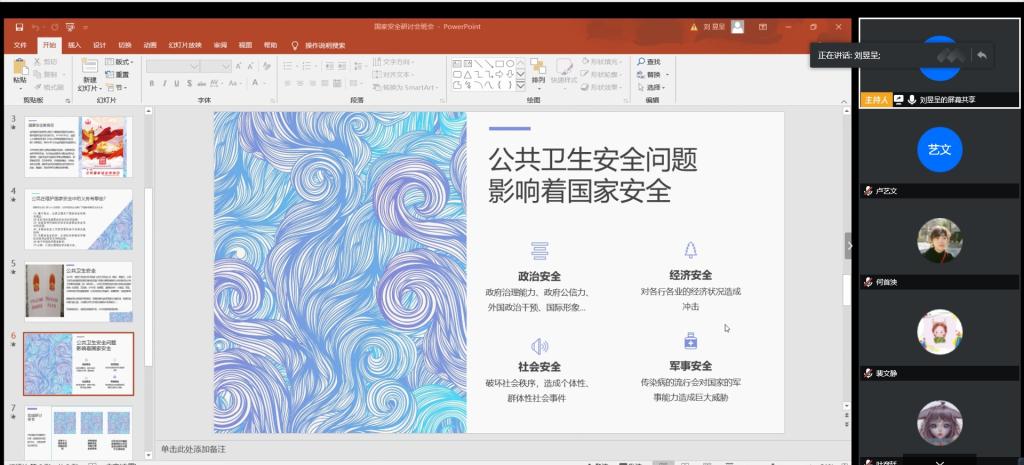 会议伊始,刘昱呈先通过一个知识问答的小互动,向大家介绍了这个特殊的日子——国家安全教育日。她向同学们详细介绍了国家安全基本内容与现实状况,并结合此次新冠肺炎疫情情况,着重介绍了公共卫生安全。