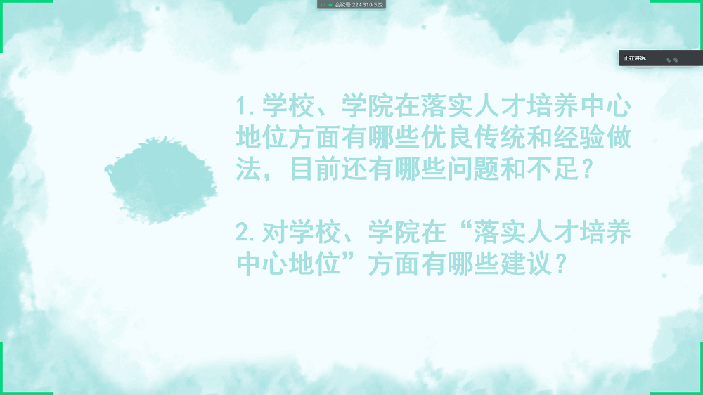 会议伊始,李鹏程同学对此次班会主题做简要介绍,接着同学们围绕“落实人才培养中心地位”表达了各自的观点和看法。夏仁辉同学表示,学院开展的“学术文化节”系列活动有利于引导学生充分利用学习空闲时间。李欣玉同学表示,学院重视学生的成长成才,读书会、德育活动、学习经验分享会等活动为学生提供了高质量的自我展示和提升平台。此外,学院“本科生导师制”让许多同学拥有了量身设计的指导,赢得了同学们一致认可和赞扬。