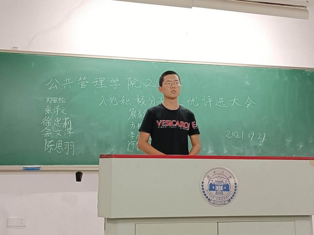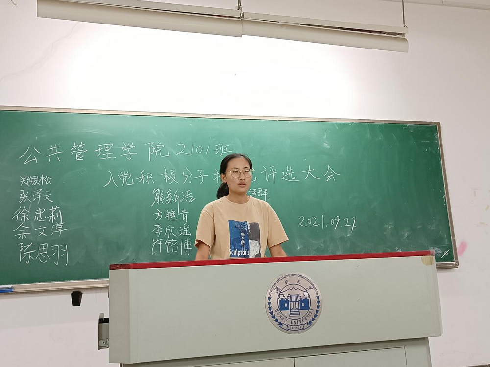 9月27日下午,行政管理2101班团支部于综合楼419教室举行入党积极分子推优评选会。本次会议由团支书高泽群主持,院团委组织部干事全程监督,行政管理2101班团支部全体成员参加。