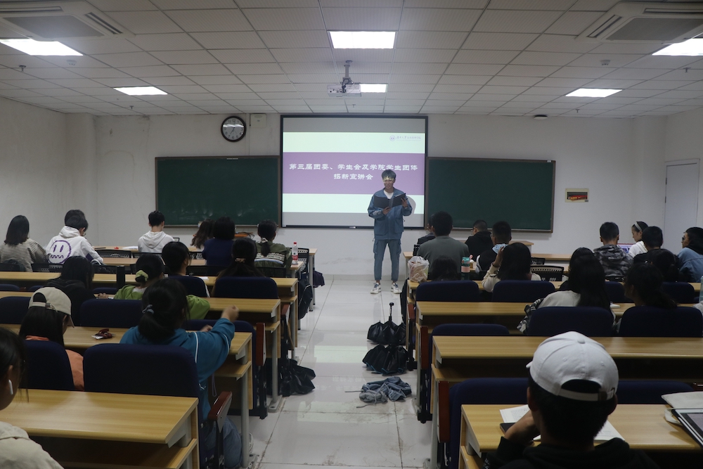在研楼C201教室召开团委、学生会及学生团体招新宣传会。本次会议由学生会活动部负责人常铖主持,本科生辅导员闫振振老师、团委、学生会、各学生团体代表以及2021级全体新生参加会议。