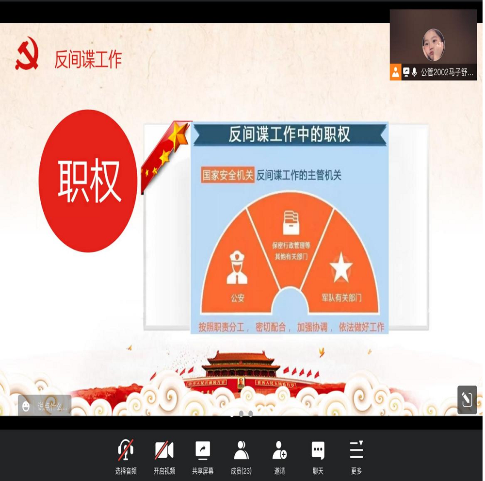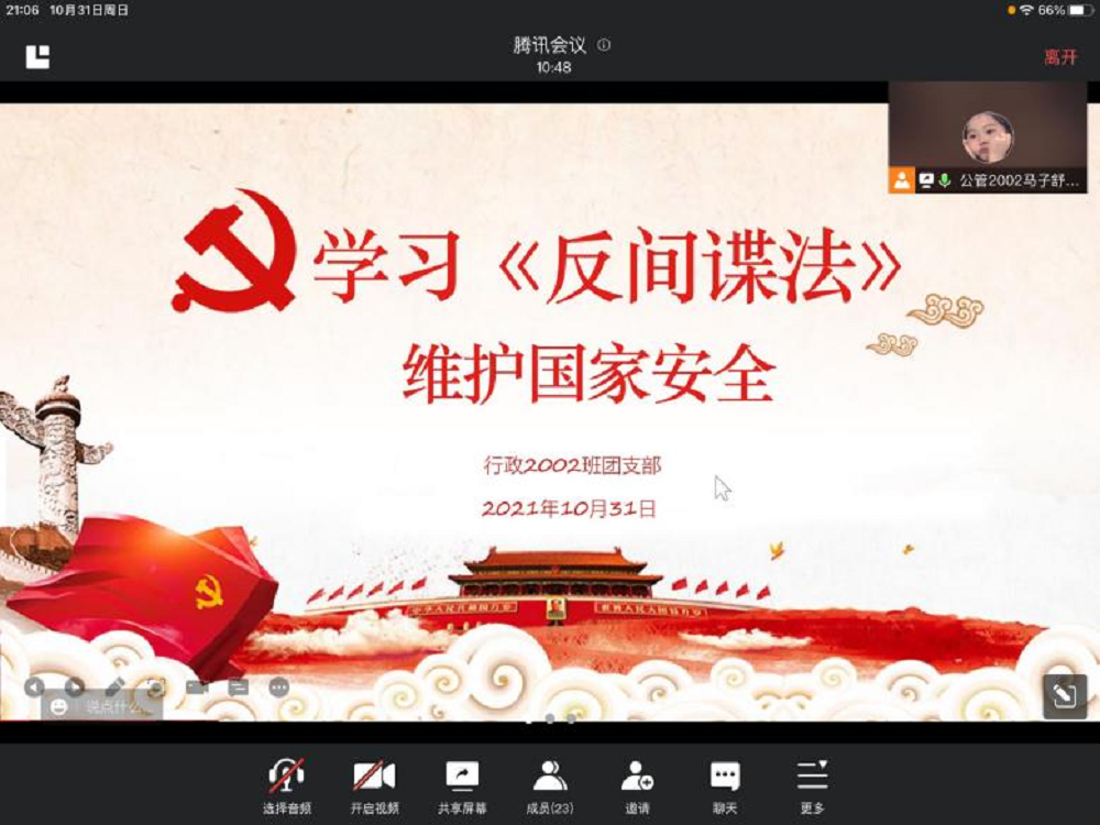 行政管理2002班组织开展“反间谍法”宣传教育主题团日活动。应疫情防控要求,本次活动通过腾讯会议在线上开展,由团支书马子舒主持,行政管理2002班全体同学参加。
