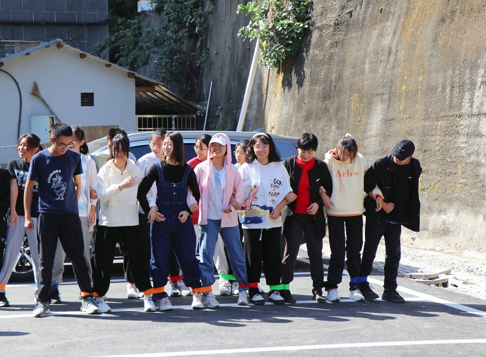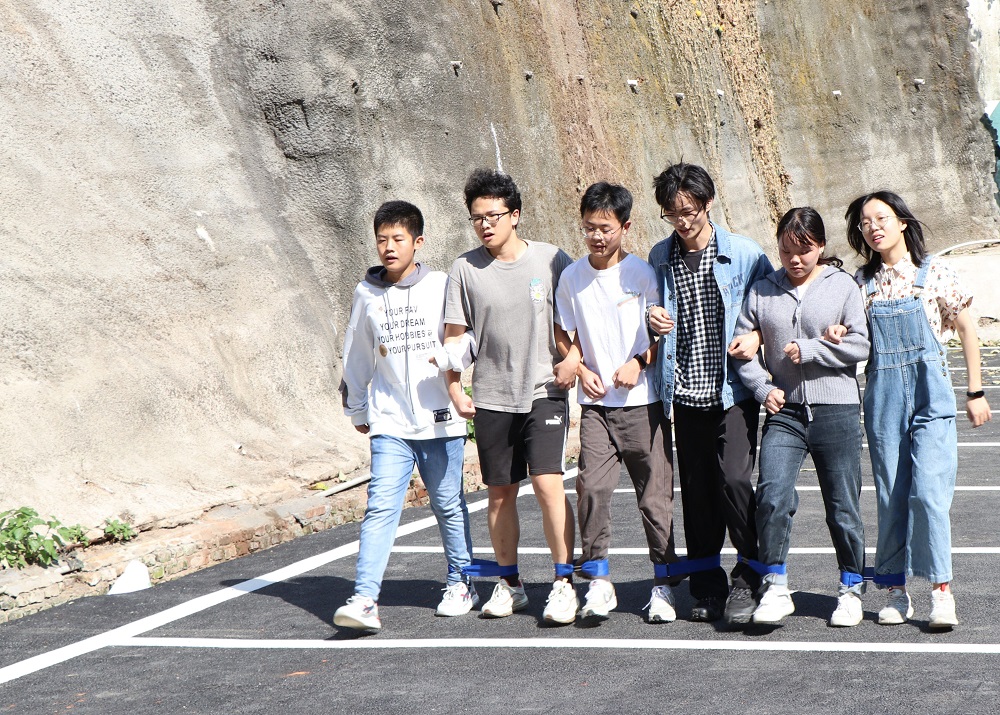 “比赛开始前,参赛队伍的全体队员双脚固定在比赛器材上,立于起跑线后。裁判发令后,参赛队员协调配合在跑道上共同行进。”经过一次次手足无措的练习,大家终于获得脚往一处迈、劲往一处使的默契。每组都以亮眼的表现完成了“协力竞走”。