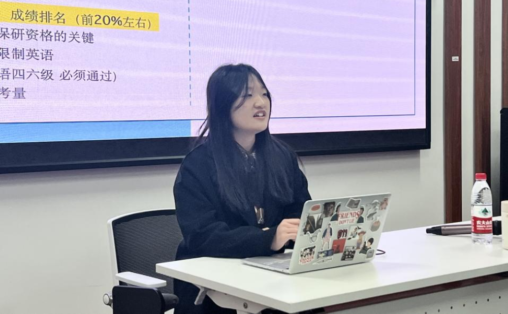 分享者的演讲各有侧重,各具风格,既充分体现了自己过人的学术素养,也给大家带来耳目一新的感受。在场的同学们认真倾听并记录,现场氛围活跃。在交流互动环节,面对同学们的积极提问,学长学姐们倾囊相授,向大家分享了跨专业保研的注意事项、学硕专硕的区别等,并针对本科的研究设计提出先不必计较功利性的真诚建议,简单介绍了往年保研情况。