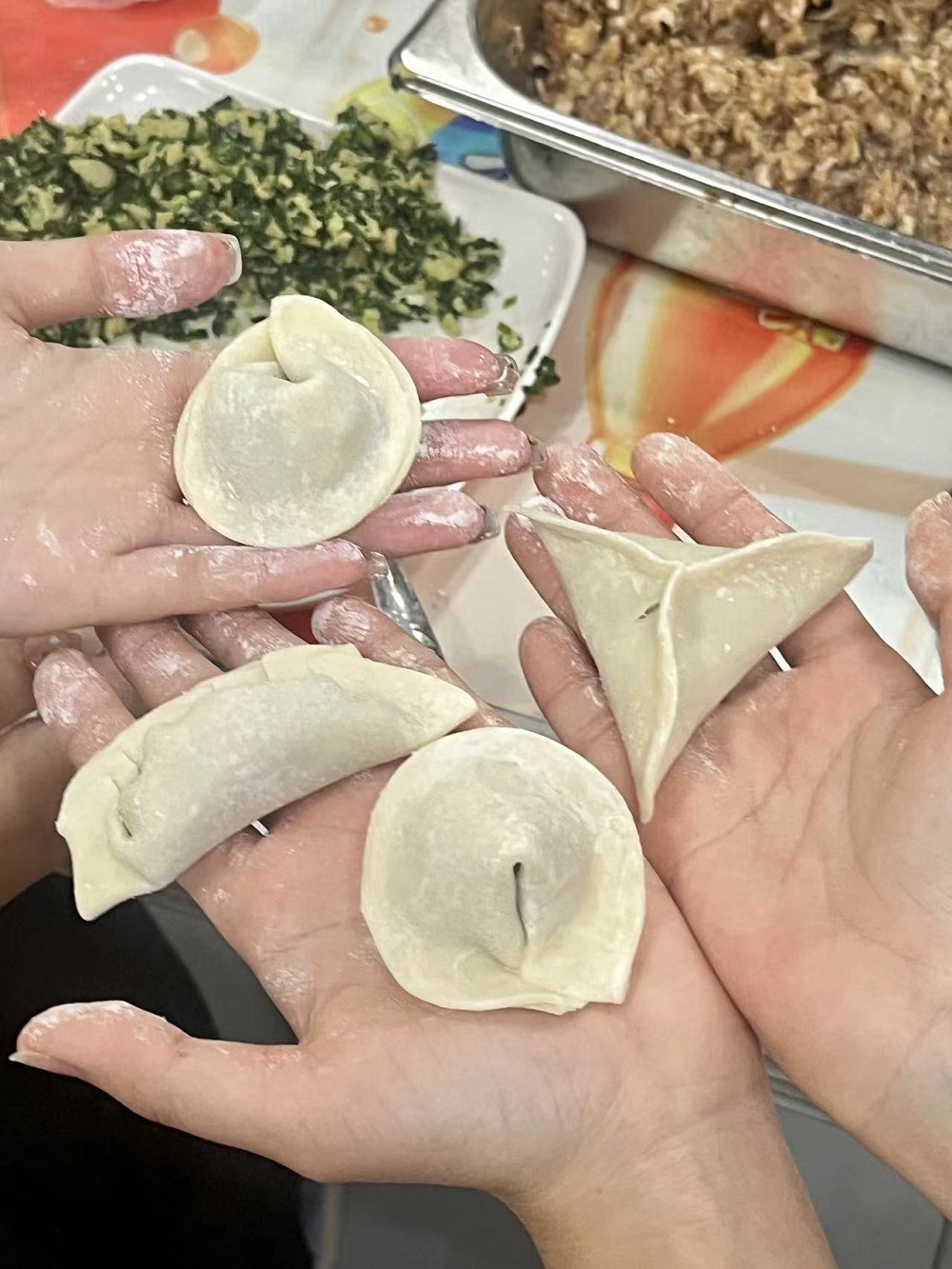 “冬至不端饺子碗,冻掉耳朵没人管。”在这个寒冷的冬日里,谁不想来上一盘热乎乎的暖胃饺子?白饺香醋,热汤暖炉,朋友围坐,共话往事,共享欢愉。同学们在食堂师傅的热情协助下开始包饺子,“看!我会包饺子啦!”“这个怎么包的呀?”“这个饺子好漂亮!”“我一定要吃到幸运饺子!”……同学们有说有笑,虽然包的技术不大娴熟,但干劲十足,热情满满。大家纷纷晒出自己的作品,心中满满的成就感与自豪感!很快,一盘盘大家亲手制作的饺子顺利出锅啦!在大家都在猜幸运饺子花落谁家时,吃到幸运饺子的同学十分激动地向大家展示幸运硬币,还收获到了幸运小礼物。每个同学都沉浸在包饺子的乐趣与吃饺子的幸福中,心中倍感温暖。