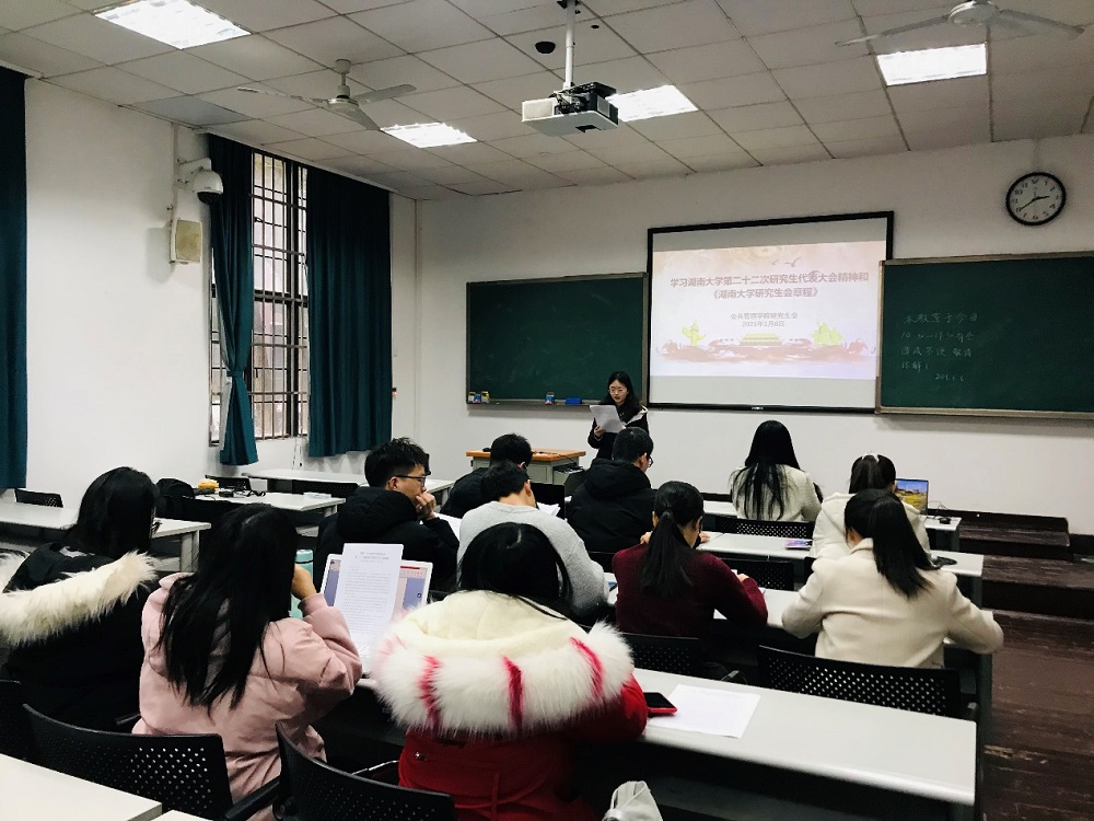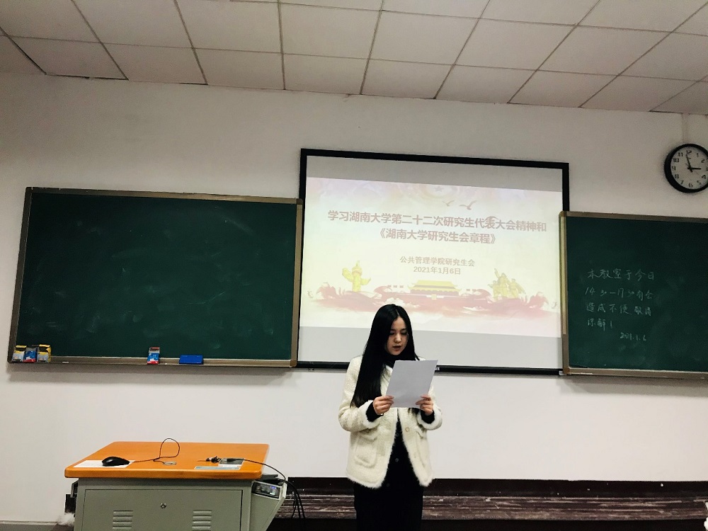 学院研究生会副主席过天瑶带领大家学习《湖南大学研究生会章程》,结合学院研究生会过去一年开展的工作,要求大家明确自身作为学生干部的职责,代表同学发声,维护同学权益。